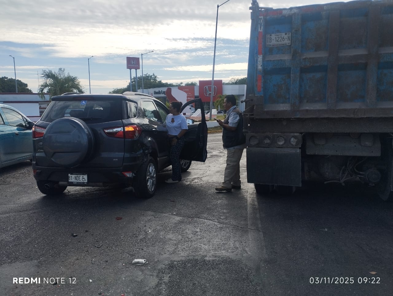 Chetumal.- Un volquete de carga provocó un accidente vehicular durante la mañana de este lunes en la glorieta de acceso a la ciudad de Chetumal, en la intersección de las avenidas Prolongación Álvaro Obregón y Revolución.