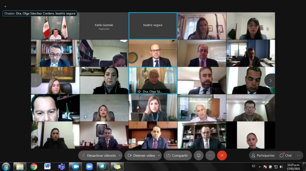 En esta reunión, que se realizó a través de video-conferencia, participaron la Secretaria de Gobernación Olga Sánchez Cordero; el Embajador de la OEA, Adam Namm; el Jefe de la oficina de la embajada de los Estados Unidos para el apoyo al combate del narcotrafico, Alberto Rodriguez; el Gerente del Programa de Justicia Terapéutica de la OEA, Jefreyy Zinsmeister; así como los Presidentes de los Triibunales de Justicia de cinco Estados y los representantes de diecinueve Poderes Judiciales.